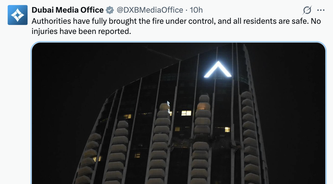 The resident highlighted the speed and efficiency of Dubai’s emergency services. “The fire department and ambulances arrived in a matter of three minutes. Literally, in five minutes, the fire was out,” he said. “They were also in the process of evacuating the building safely.”