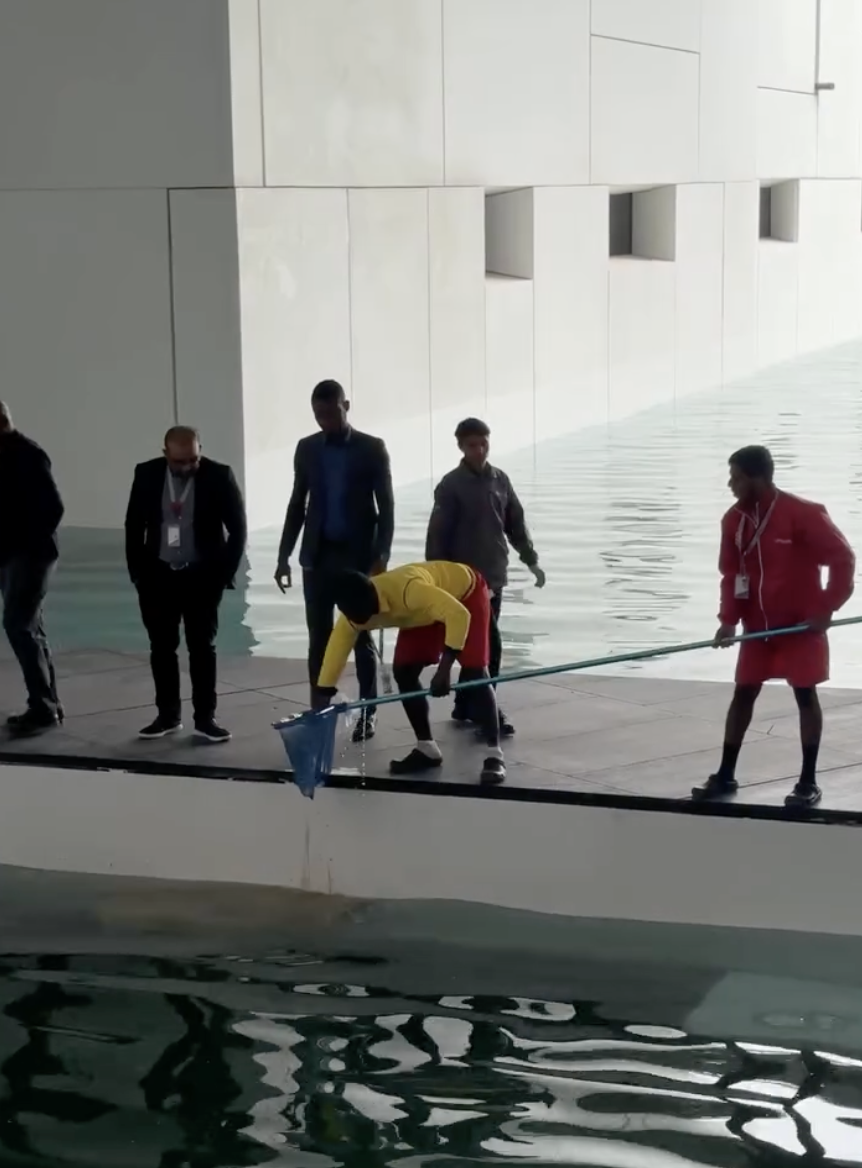 A video filmed at Louvre Abu Dhabi is currently making rounds online after a tiny human decided a brand-new iPhone belonged in the water feature instead.