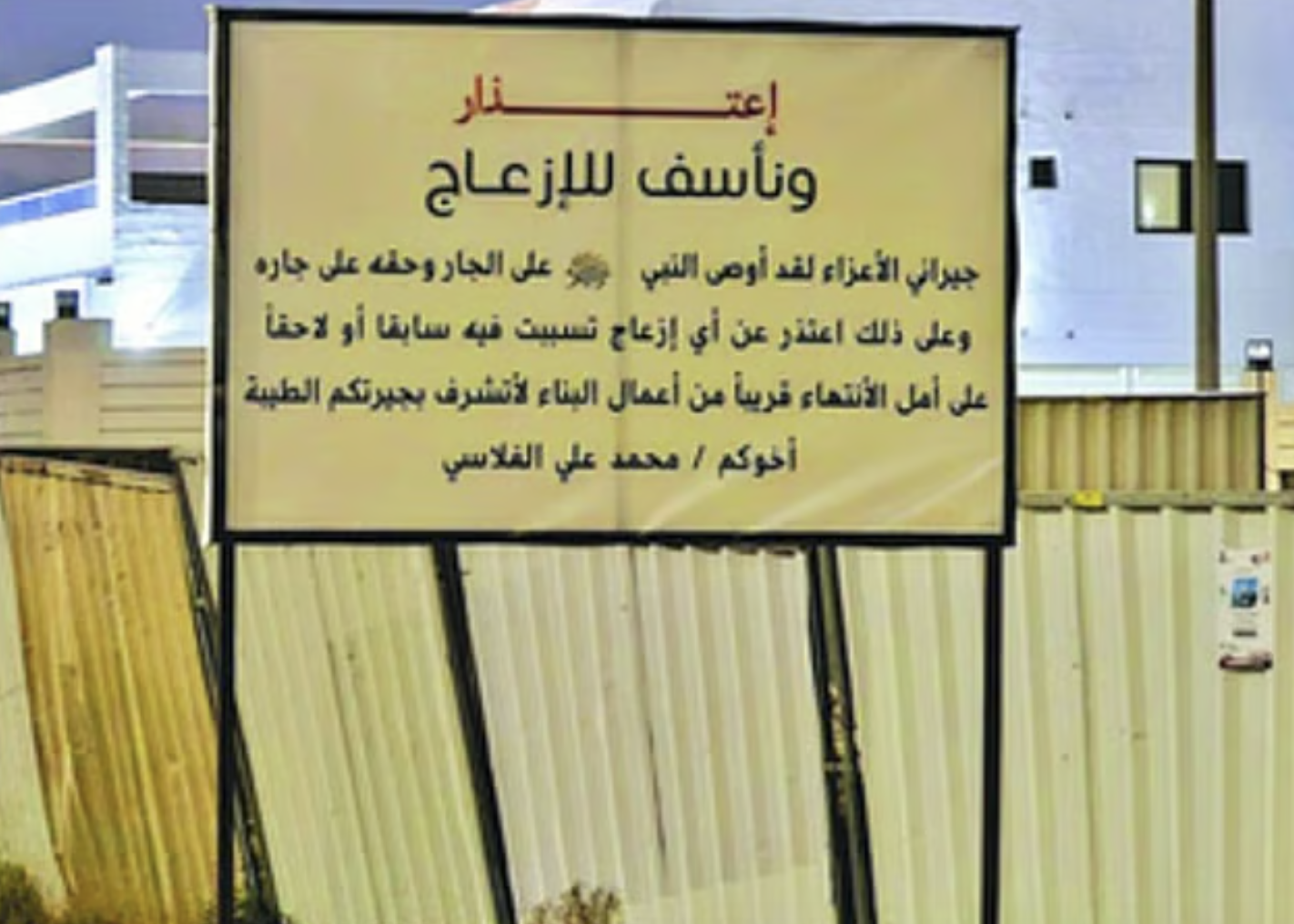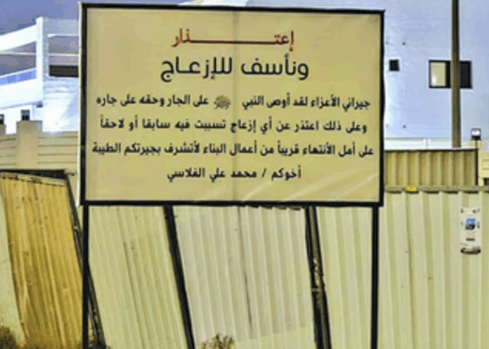 My dear neighbours, the Prophet urged kindness towards one’s neighbour and the rights they have. I apologise for any disturbance I have caused in the past or may cause in the future, and I hope to complete the construction soon so I can be honoured with your good neighbourliness.