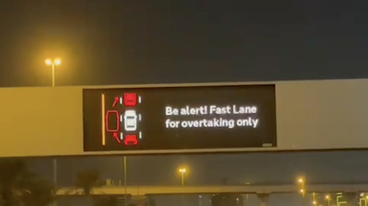 You’ve probably noticed new electronic road signs popping up across Dubai’s major roads. They’re not just for decoration… they flash a clear warning: “Be alert! Fast Lane for overtaking only”. There’s even a graphic showing exactly what staying put in the fast lane looks like, so no excuses.