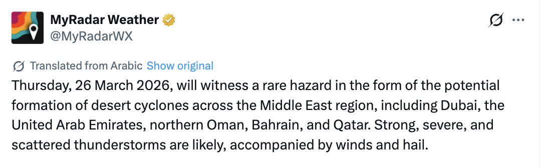 The post The UAE Is Set To Hit Peak Storm Conditions On Thursday With A Risk Of Tornadoes In The Region appeared first on Lovin Dubai.