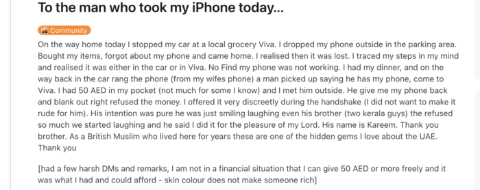 When he arrived, the stranger, a man named Kareem, handed over the phone, but refused any reward. Even when 50 AED was discreetly offered, Kareem, the man who found the phone, just smiled and said he did it “for the pleasure of my Lord.”